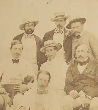 Știrbei was subsequently a noted player in the "monstrous coalition", grouping left-liberals and "White" conservatives against Cuza and his centrist government.[88] In September 1863, he and D. Ghica were star defenders at Rosetti's own trial for sedition. Appearing alongside Brătianu and Anastasie Panu, Știrbei now spoke about press freedom as being vital for civic education.[89] With Cuza taking more radical positions on land reform, Știrbei also revised his stance. Alongside a bipartisan committee (comprising Rosetti, Brătianu, Panu, Ion Ghica, Anton I. Arion, Grigore Arghiropol and Nicolae Golescu), he now supported the sale of state land to the landless.[90]
