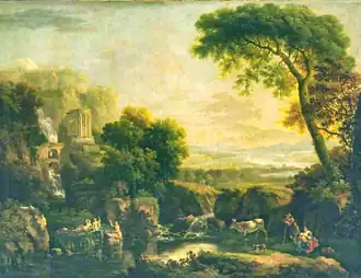 A source of Barret's earliest landscape paintings came from the re-working of engravings of classical Italianate scenes of artists such as Claude Lorrain. A pair of paintings sold in 2013, came from the collection of the Rev. Samuel Madden (1686–1765). Madden established a series of prizes at Trinity College, Dublin, to reward agricultural and artistic enterprise, designed an important landscape garden on the shores of Lough Erne, founded the Dublin (later Royal) Society, and left an important collection of 17th- and 18th-century Italian pictures to Trinity College.[5] These two paintings were based on engravings of two paintings by Claude Lorrain. One of these is after Landscape with a rural dance, which belonged to the Duke of Kingston. The second is a Landscape with Argus guarding Io, purchased by the first Earl of Leicester and still at Holkham Hall, in which Barret has reversed the image in his painting. There are a number of other Italianate paintings showing ruins which Barret probably painted before developing his series of Irish landscapes.