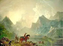 George Barret produced a notable series of paintings of scenery in Wales, some of which have considerable similarity to views by Richard Wilson. A few of these paintings may have been completed shortly after his arrival in England. An oil-painting of Hawarden Castle in Flintshire was exhibited by Barret at the Society of Artists in Great Britain in 1765.[38] However, it seems likely that most of Barret's Welsh paintings were produced towards the end of his life. In the mid-1770s Wales was becoming an increasingly popular destination for wealthy tourists.