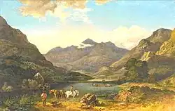 In the summer of 1777 Henry Penruddocke Wyndham made his second tour through Wales accompanied by the Swiss artist Samuel Hieronymus Grimm, who is very likely to have known Barret. Wyndham's Tour through Monmouthshire and Wales published in 1781, started with at the Severn and worked round the Welsh coast to Snowdonia before returning along the Welsh borders. This was a route followed by many tourists and Wyndham's book was the first published guidebook with illustrations of the scenery. Surviving oil-paintings by Barret suggest that he must have made a similar tour, starting in the south and many of his oil paintings are taken from similar viewpoints to those used by Grimm.[39] The Government Art Collection has oil-paintings by Barret of both the Severn and Wye confluence and Cilgerran Castle on the borders of Cardiganshire and Pembrokeshire. There are a number of paintings which may portray scenery in Merionethshire and in Snowdonia Barret produced a number of paintings of Snowdon from Llyn Nantle and Llyn Padarn. Unlike Richard Wilson he did not paint Caernarfon Castle, but he did produce at least five different versions of a painting of Conway Castle.[40]