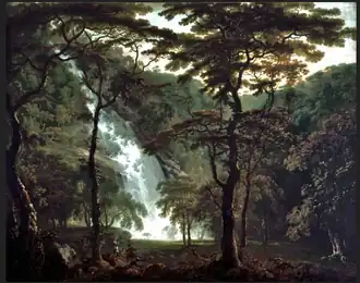 Barret painted for the Duke of Buccleuch from about 1768 to 1771. These were probably for Dalkeith Palace. Barret exhibited Part of Melrose Abbey by Moonlight at the Royal Academy in 1769, which is now at Drumlanrig Castle.[23] Ellis Waterhouse notes seven views of Dalkeith Park by Barret in the Buccleuch collection at Bowhill, Selkirk. These, Waterhouse remarks, are his most memorable surviving works. They were a conscious attempt at providing a native British type of landscape composition in opposition to Richard Wilson's Italianising patterns.[24]