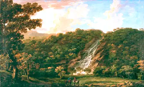 Following work for Samuel Madden and the Earl of Milltown, Barret started to produce paintings of Irish landscapes. These portrayed the actual landscape and not capriccio scenery. This was a natural progression from his previous idealised Italianate scenery. Barret is particularly associated with Edward Wingfield who in 1751 became Viscount Powerscourt.[9] Wingfield owned Powerscourt House and extensive estates to the south of Dublin in County Wicklow. These included the scenic river Dargle with its craggy red rocks and impressive Powerscourt Waterfall that is the second highest in Ireland. Scenery on the Dargle often figures in Barret's surviving oil paintings and he also painted at Avoca in the south of County Wicklow.[10] A View of Powerscourt House under the Sugar Loaf Mountain is now at the Yale Center for British Art, and a version of Barret's Powerscourt Waterfall is in the National Gallery of Ireland.[11]