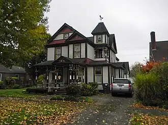 The roof is situated above a high cross gable with a pyramidal turret in the northeast corner. At the time of the NRHP nomination, the wood shingles on the roof were replicated to match those on the home in the 1920s. The exterior walls contains a boxed cornice and repeated decoration of a dentil band frieze. The asymmetrical structure is pronounced due to several projecting pediment gables. Cladding includes a mixture of clapboard, endboards, and fish scale shingles. Decorative moldings and posts on the front porch augment the curved curvilinear arches and a pediment gable at the front entrance. Continuing an overall theme to the exterior of the building, the porch is adorned with a boxed cornice and frieze, and decorative brackets. A matching side porch lacks a balustrade, which was replaced with a boxed railing covered in fish scale shingles.[2]