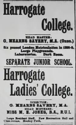 - ^ "Educational. Harrogate Ladies' College". Methodist Times. 26 May 1898. p. 5 col.3. Retrieved 9 April 2025 – via British Newspaper Archive.