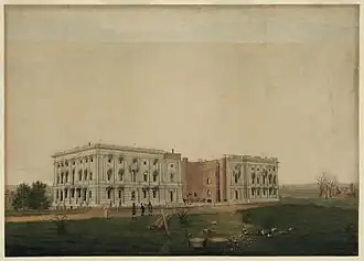 Munger specialized in portraits and miniatures, although his most famous paintings today are a pair of landscapes.[3] His watercolor entitled The President's House was painted following the fire of August 24, 1814, set by British troops during their invasion of Washington, D.C. in the War of 1812. The painting shows the burned shell of the White House from a distance, starkly emphasizing its ruin and isolation in the surrounding landscape of sparse trees. The view is from a public common to the northeast of the White House.[4] A curious detail in the painting is an S-shaped curve on the rooftop that at first glance appears to be a stray hair caught on the paper. An explanation for this is offered by historian William Kloss writing for the White House Historical Association: