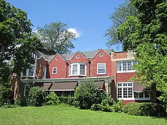 The George R. Thorne House is a historic house at 7 Cottage Row in Midlothian, Illinois. The house was built in 1899 as a summer home for George R. Thorne, who co-founded Montgomery Ward and founded the adjacent Midlothian Country Club. Howard Van Doren Shaw, a Chicago architect known for designing large homes for wealthy and prominent people, designed the house. The house's exterior blends the Tudor Revival and Shingle styles, while its interior is inspired by the Arts and Crafts Movement. Its design features three shingled gables above the long front porch, a brick parapet in front of a half-timbered gable at the southwest corner, and a shingled block with brick piers and limestone detailing at the southeast corner. Architect N. Max Dunning renovated the house in 1914 to convert it to a year-round residence.[2]