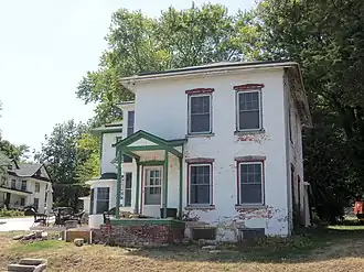 The George Tromley Sr. House is a two-story structure that was built in two sections.[4] The older section of the house is in the front and is constructed of brick, that is now painted white, and is capped with a low pitched hipped roof. It features a three-bay front with the main entrance to the left that is sheltered by a small gable roofed porch. It is probably a later addition. The windows have lintels with nearly flat pediments. The newer section was built of frame construction on the back of the older section, and it is also capped with a hipped roof. Its windows are set in flat enframements and are topped with narrow cornices. A single-story porch with pent roof is located in the angle formed by the two sections. It is supported by slender turned posts. A two-story rectangular bay, with a small pent roof separating the two stories, protrudes from the south side of the older section. A single-story polygonal bay is located on the southeast corner of the newer section.
