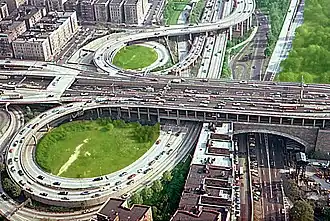 The plans for the Hudson River bridge's Fort Lee approach were also changed in January 1930. Originally, the bridge would have terminated in a traffic circle,[130] a type of intersection design that was being built around New Jersey during the 1920s and 1930s.[131] However, the revised plans called for a grade-separated highway approach that would connect to a traffic "distributing basin" with ramps to nearby highways.[130] The total cost of land acquisition for the bridge approaches on both sides of the Hudson River exceeded $10 million.[132]