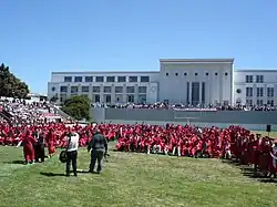 The City of San Francisco set aside $2 million in 1930 to build a high school to serve the Richmond District, its seventh public high school and most expensive school at that time. The three-story academic building was designed by Timothy L. Pflueger and inspired by Washington's home in Virginia, Mount Vernon.[4] It was planned to accommodate 3,000 students.[8] Arnautoff was assisted by George Harris and Gorden Langdon in his work on the murals,[8] and the school also has mural work by Ralph Stackpole, Robert Boardman Howard, and Lucien Labaudt,[9] and bas relief faces by Arnautoff of Washington, Thomas Edison, and William Shakespeare above the main doors.[6][10] A bas relief frieze on the wall of the football stadium, Athletics, is by Beniamino Bufano and Sargent Johnson.[8]