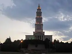 In February 1929, the GWMNMA learned that $400,000 in cash donations were received in 1928.[95] When work on the structure began again in March 1929, the terrace and lawns were resodded.[71] The first Masonic degrees were conferred in the unfinished memorial in mid-October 1929.[96] The first Blue Lodge meeting to be held at the memorial occurred on November 14, 1929.[97] With so many skilled workers unemployed due to the Great Depression, the association was able to hire more men at lower wages than before. By February 1930, the tower section had risen to 190 feet (58 m) above elevation, 50 feet (15 m) more than the construction schedule anticipated.[98] At the GWMNMA annual meeting, the association voted to establish a $1 million endowment fund to maintain the memorial after it was completed.[99] In 1930, the association spent $225,000 on the memorial.[100] That same year, GWMNMA President Watres donated a large Celesta-like set of chimes for the memorial's tower.[67][101] The tower was completed, and floors for the eighth, ninth, and tenth levels installed.[102]