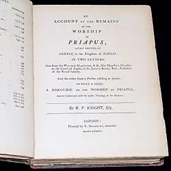 In the 1860s there was a lot of interest in the theories concerning the worship of Priapus and Witt organised for Richard Payne Knight's Discourse on the worship of Priapus and its connection with the mystic theology of the ancients to be republished with additional material and illustrations in 1865.[2] Following an illness the same year, Witt approached the British Museum to enquire whether they would take his collection. The museum's director Anthony Panizzi agreed to take the objects even though they became a major part of a secret collection known as the museum's Secretum.[7] Panizzi did not think twice as he considered the collection to be of the right quality for his museum. The collection appeared to be chosen primarily on the basis of its obscenity. The collection included modern photographs of women partially dressed as gladiators which were not thought to be academic artefacts but they were designed to be erotic. One of the artefacts was a toothed chastity belt which was thought to be medieval but was in fact a contemporary invention.[3] In general however Witt's collection covered the major civilisations of Greece, Rome, Egyptian, Indian, Chinese, Tibetan, Japanese and Native American. Besides votive objects, bronzes and pottery his collection also included watercolours and sketches. Of particular note were his library and the records of his correspondence which included the details of objects not in the collection including a catalogue of the secret cabinet of Naples Museum.[2] Following the acceptance of his collection by the British Museum in 1865, Witt published "Catalogue of a Collection Illustrative of Phallic Worship" in 1866 to commemorate the approval of his artefacts by Panizzi.[5]