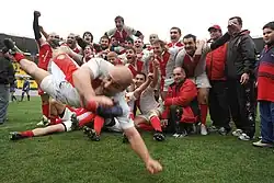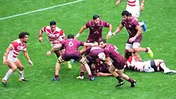 Lelo or lelo burti (Georgian: ლელო ბურთი), literally a "field ball [playing]", is a Georgian folk sport, which is a full contact ball game, and very similar to rugby, itself a public school codification of older folk football games.[6] Within Georgian rugby union terminology, the word lelo is used to mean a try, and the popularity of rugby union in Georgia has also been attributed to it.[7] In 2014, lelo burti, along with khridoli, a traditional martial art, was inscribed by the government of Georgia as a "nonmaterial monument" of culture.[8]