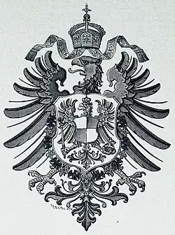 According to Neubecker, the German imperial eagle goes back to the ancient Romans, and the newly crowned emperor Charlemagne erected an imperial eagle – a symbol that would carry over all the way to modern Germany – at his palace at Aachen. From the 13th century, Neubecker continues, the view was generally held that the eagle of the emperor should have two heads, while that of the future emperor should have one, a policy that was codified by the emperor Sigismund in 1401.[9] The imperial double eagle was again resurrected by the emperor Francis II and became the symbol of the Austrian Empire.[15]