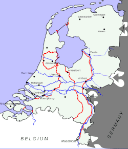 In the 17th century, the Dutch Republic had devised a defensive system called the Hollandic Water Line, which during the Franco-Dutch War protected all major cities in the west, by flooding part of the countryside. In the early 19th century this line was shifted somewhat to the east, beyond Utrecht, and later modernised with fortresses. This new position was called the New Hollandic Water Line. The line was reinforced with new pillboxes in 1940 as the fortifications were outdated. The line was located at the extreme eastern edge of the area lying below sea level. This allowed the ground before the fortifications to be easily inundated with a few feet of water, too shallow for boats, but deep enough to turn the soil into an impassable quagmire. The area west of the New Hollandic Water Line was called Fortress Holland (Dutch: Vesting Holland; German: Festung Holland), the eastern flank of which was also covered by Lake IJssel and the southern flank protected by the lower course of three broad parallel rivers: the Meuse (Maas) and two branches of the Rhine. It functioned as a National Redoubt, which was expected to hold out a prolonged period of time,[69] in the most optimistic predictions as much as three months without any allied assistance,[70] even though the size of the attacking German force was strongly overestimated.[71] Before the war the intention was to fall back to this position almost immediately, after a concentration phase (the so-called Case Blue) in the Gelderse Valley,[72] inspired by the hope that Germany would only travel through the southern provinces on its way to Belgium and leave Holland proper untouched. In 1939 it was understood such an attitude posed an invitation to invade and made it impossible to negotiate with the Entente about a common defence. Proposals by German diplomats that the Dutch government would secretly assent to an advance into the country were rejected.[73]