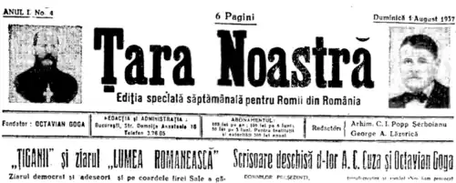 By October 1937, the PNC was credited with real chances of forming the Romanian cabinet. This matter was reviewed in a satirical column by Ion Anestin, who mocked "Lăzurică the blond" as a kingmaker; Anestin also joked on Goga's usage of blue as the party color, ridiculing his Romani alliance as baniera albastră cu tuciuriu ("the blue-and-grime banner").[144] In his first-ever Țara Noastră editorial, Șerboianu, passing himself off as a member of the Romani community, reported that he had always fought alongside "the Roma comrade G. A. Lăzurică, who was not overcome either by intrigues, either by the lures or the cowardice of some of our brethren."[145] Their platform, also taken up by Mirmillo, simply denied that Romanies were an ethnic minority, generally describing them as a variety of the Romanian people; they also argued that, being "too good Romanians", they would limit Romani-language content to just one page of the newspaper.[146] As noted by Matei, Lăzurică and Șerboianu had fully reconciled and "could pass for Romani leaders" when negotiating with their PNC counterparts, Goga and A. C. Cuza; instead, the UGRR remained tied to the mainstream National Liberals.[147]