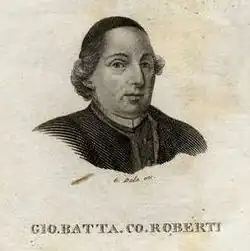 Born in Bassano del Grappa, on 20 May 1736 Roberti entered the Society of Jesus and in 1743 he was ordained a priest.[1] He taught in the Jesuit colleges of Piacenza, Brescia, Parma and Bologna.[1] In Brescia he befriended Saverio Bettinelli and wrote his first works. He displayed a moderately progressive outlook in his didactic poems Le fragole (1752) and La commedia (1756), which praises Carlo Goldoni's theatrical reforms.[2] A close friend of Giampietro Zanotti, Roberti was a member of the Accademia dei Gelati of Bologna.[1] In his essay Del leggere i libri di metafisica e di divertimento (1769), Roberti refuted the anonymous pamphlet De la prédication, attributed to Voltaire, and denounced the irreligiosity and licentiousness of contemporary literature.[1] The work was translated into German and published in Augsburg in 1788.[1]