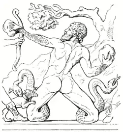 With the beginning of the fourth century BC probably comes the first portrayal of the Giants in Greek art as anything other than fully human in form, with legs that become coiled serpents having snake heads at the ends in place of feet.[126] Such depictions were perhaps borrowed from Typhon, the monstrous son of Gaia and Tartarus, described by Hesiod as having a hundred snake heads growing from his shoulders.[127] This snake-legged motif becomes the standard for the rest of antiquity, culminating in the monumental Gigantomachy frieze of the second century BC Pergamon Altar. Measuring nearly 400 feet long and over seven feet high, here the Gigantomachy receives its most extensive treatment, with over one hundred figures.[128]