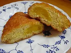 The japonesa (English: Japanese lady) is a sweet fried doughnut filled with a custard-like cream. Japonesas are usually enjoyed at teatime or as a snack. They are traditionally coated in syrup or granulated sugar.[7] The name is a reference to Japanese dorayaki cakes which are similarly shaped and also have a sweet filling.