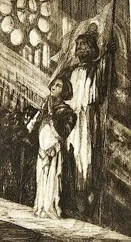 Gilles de Rais eventually became engaged to his third cousin Catherine de Thouars,[55] daughter of Miles II de Thouars and Béatrice de Montjean. In addition to the obstacle posed by the consanguinity of Gilles de Rais and Catherine de Thouars, who were 4th-degree relatives,[56] disputes arose between the House of Craon and Miles II de Thouars, lord of Pouzauges and Tiffauges.[57] Ignoring these constraints and without waiting for an ecclesiastical dispensation, Gilles de Rais abducted Catherine de Thouars and married her in a chapel outside his parish church, without publishing banns of marriage.[58] Despite a marriage contract drawn up on 30 November 1420,[59] the two young people had their union annulled and declared incestuous by the Church.[60]