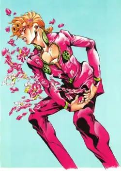 Giorno is at an airport, trying to swindle the belongings of unsuspecting tourists when he encounters Koichi Hirose, who is trying to find Haruno Shiobana by the orders of Jotaro Kujo after finding out he is the son of Dio, unaware that Haruno is now Giorno.[15] After escaping from Koichi when he took his briefcase, he is confronted by Passione member Leaky-eye Luca, who is killed by Giorno.[16] He is then sought by Bruno Bucciarati who's investigating Leaky-eye Luca's case.[17] Giorno manages to win over Bucciarati by giving his reasons as to why he wants to join the mafia and both find commonality in their goals. He is advised to take a test by capo Polpo in order to become a member of Passione.[18] After a reencounter with Koichi where the latter is convinced of the goodness living within Giorno, he passes the test. He indirectly kills Polpo through the use of a gun possessing as a banana, as Polpo has killed an innocent bystander during an earlier confrontation.[19]