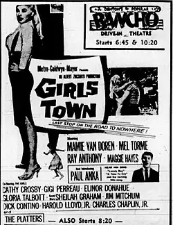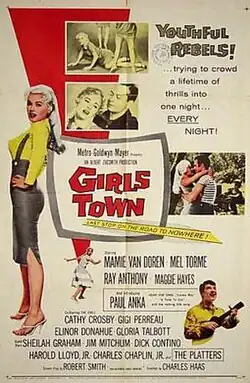 Girls Town is a 1959 American drama film directed by Charles F. Haas and starring Mamie Van Doren, Mel Tormé, and Ray Anthony. Paul Anka also appears in his first acting role. Van Doren stars as a juvenile delinquent who is sent to a girls' school run by nuns, where she finds herself unable to help her sister. The film capitalizes on the 1950s rebellious-teen exploitation films, with catfights, car races, music from Anka and The Platters, and sexy outfits.
