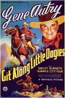 Git Along Little Dogies is a 1937 American Western film directed by Joseph Kane and starring Gene Autry, Smiley Burnette, and the Maple City Four. Written by Dorrell and Stuart E. McGowan, the film is about a singing cowboy who gets caught up in a war between oilmen and cattle ranchers, taking the side of the ranchers until he learns that oil will bring a railroad to town.[1] The film is also known as Serenade of the West in the United Kingdom.[2]