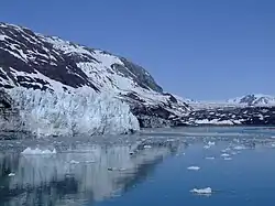 The Margerie Glacier is a 21 miles (34 km) long tide water glacier that begins on the south slope of Mount Root, at the Alaska-Canada border in the Fairweather Range (elevation above 9,000 feet (2,700 m)), and flows southeast and northeast to Tarr Inlet, one mile (1.6 km) north of the terminus of Grand Pacific Glacier and 87 miles (140 km) northwest of Hoonah. It was named for famed French geographer and geologist Emmanuel de Margerie (1862–1953), who visited Glacier Bay in 1913.[25][29] Located at the deep end of the Glacier Bay, Margerie Glacier extends over a width of about 1 mile (1.6 km) and extends upstream for a length of 21 miles (34 km) till its source on the southern slopes of the hill of Mount Root, at the Alaska-Canada border. Mount Root (elevation 12,860 feet (3,920 m)), named Boundary Peak 165, is a mountain in Alaska and British Columbia, is part of the Fairweather Range of the Saint Elias Mountains.
