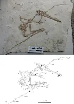 The holotype, IG-CAGS-08-07, includes the almost complete skull, the lower jaws, the front neck vertebrae and part of a hindlimb.[1] In 2016, a second specimen was referred, JPM 2014–004, a juvenile from the Jiufotang Formation. It represents an almost complete skeleton, missing only the left hindlimb, the rear back vertebrae, the sacrum and the tail. Though the holotype was originally considered an adult, the new exemplar indicates that IG-CAGS-08-07 was a juvenile also.[2]