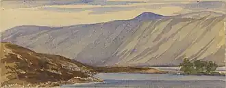 Victoria and Albert's first visit to Balmoral was when they stayed there for the autumn of 1848.[9] They visited the nearby hunting lodge called Allt-na-giubhsaich[note 3] near the foot of Loch Muick and in August next year they stayed overnight at this lodge – in the meantime it had been extended and improved although Victoria still regarded it as our "little bothie". By the time they stayed at the lodge the following year John Brown had become one of the queen's attendants – he was one of a team of four servants who rowed her party to the head of the loch. On 30 August 1849 she wrote about the location "The scenery is beautiful here, so wild and grand – real severe Highland scenery, with trees in the hollow. We had various scrambles in and out of the boat and along the shore, and saw three hawks, and caught seventy trout. I wish an artist could have been there to sketch the scene; it was picturesque – the boat, the net, and the people in their kilts in the water, and on the shore."[10]