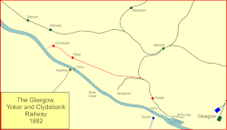 The railway opened as a single line on 1 December 1882, with stations at Partick (on the Stobcross line) and Yoker. Partick could be reached by the Govan Ferry, and the Yoker station was not far from the Renfrew ferry. Goods traffic was of course significant, and the passenger service was not connected to the rest of the railway network for the time being; there was no passenger station at Stobcross. The passenger trains were not run at suitable times for the workers at first, and they continued to use the steamer.[3] The line was worked by the North British Railway.[1][2][4][5]