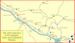 In July 1872 the Clyde Trustees evicted the Govan shipyard of J & G Thomson, and the company established a new yard downstream on the other bank at what became Clydebank. The shipyard workers of course all lived locally to Govan, and the company conveyed them to and from their place of work in an old steamer, the Vulcan. Heavy materials too were brought in by steamer. Over the succeeding years other industrial premises opened nearby, also using the river as their transport medium.[1] J & G Thomson promoted the idea of a railway, at first to be called the Glasgow, Yoker and Dalmuir Railway, but the Forth and Cart Canal, a branch of the Forth and Clyde Canal proved awkward, and the idea was cut back to reach Clydebank only.[2][3][4]