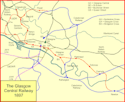 The Glasgow Central Railway was a railway line built in Glasgow, Scotland by the Caledonian Railway, running in tunnel east to west through the city centre. It was opened in stages from 1894 and opened up new journey opportunities for passengers and enabled the Caledonian Railway to access docks and industrial locations on the north bank of the River Clyde. An intensive and popular train service was operated, but the long tunnel sections with frequent steam trains were smoky and heartily disliked.