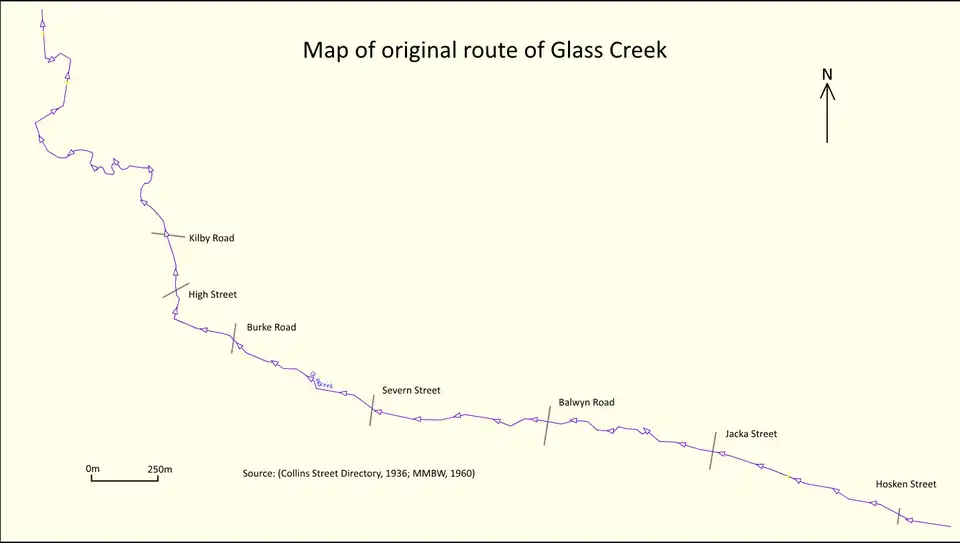 In its natural form, the creek originated near what is now Loma Linda Grove in Greythorn, the eastern part of Balwyn North. It flowed through present-day Jacka Street and Gordon Barnard Reserves, crossed Balwyn Road, through Hislop and Macleay/Myrtle Park, through the residential areas roughly following Maylands Avenue, through Stradbroke Park near present-day Kew High School, under High Street and along the present-day Glass Creek Trail before joining up to the current course near the southern entrance to Hays Paddock. Thence it flowed north-west into the Yarra River.[25]