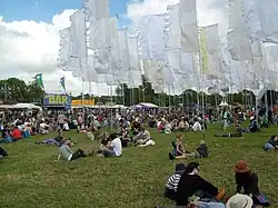 2008 saw the introduction of a new field adjacent to the Sacred space and Park Stage. Not named by the organisers, the festival goers themselves called it "Flagtopia" in reference to the flags located there.[102] After the huge number of tents left behind in 2007 and when one of Michael Eavis's cows died after ingesting a metal tent-peg left in the soil, the Festival devised its Love the Farm, Leave No Trace campaign which gently pushed revellers to respect the environment and clear up after themselves.[103] The Festival had always pushed a green agenda and new initiatives in 2008 included biodegradable tent pegs handed out free to all campers[104] and biotractors running on waste vegetable oil. These new efforts were rewarded with The Greener Festival Award for 2008 alongside a number of other festivals also committed to environmentally friendly music festivals.[105] The 2008 festival was reported to have cost £22 million to produce.[106][107]