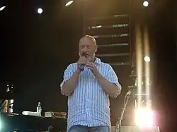 In 1994, the Pyramid Stage burned down just over a week before the festival; a temporary main stage was erected in time for the festival.[37] The 1994 festival also introduced a 150 kW wind turbine which provided some of the festival power.[38] Headliners Levellers set another record when they played to a crowd of as many as 300,000 people on their Friday performance, Glastonbury's biggest ever crowd as of 2010.[39]