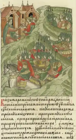 ![]() Gleb's capture, miniature from the Illustrated Chronicle of Ivan the Terrible (16th century)]] | |