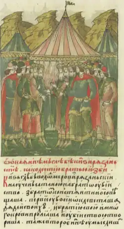 Prince Gleb Vladimirovich of Ryazan (died 1219) was a 13th-century nobleman of Kievan Rus'. He is remembered in history as an instigator of a civil war in the Principality of Ryazan.[1][2] In a bid for the throne, in 1217 he lured his brothers to a feast at Isad and executed them all, using Cuman mercenaries. Ousted by popular revolt, he was exiled to the Wild Fields and spent his old days with the Cumans.[3]