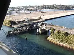 On 28 June 1903 the new bridge to Pyrmont, designed by Percy Allan, Assistant Engineer for Bridges in the NSW Department of Public Works, opened.[7] Like the ground-breaking Pyrmont Bridge being built at the same time, the second Glebe Island Bridge was a swing bridge swivelling on a massive central stone pivot-pier with timber-trussed side spans. The two bridges "are among the structures standing as monuments" to Allan's skill.[8] Under the Local Government Act 1906, the 14-hectare (34-acre) Glebe Island was added to the Municipality of Balmain.[9]
