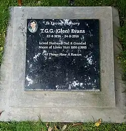At the 1971 local elections he stood as a candidate for the Lower Hutt City Council on mayor John Kennedy-Good's Combined Team ticket, but was unsuccessful.[3] Evans was elected as a Lower Hutt City Councillor on a Citizens' ticket in 1974. Initially he was successful but his position was tenuous, finishing sixteenth for the sixteen positions available and only 28 votes ahead of the next candidate. However, following the counting of special votes, he was confirmed as elected increasing his 28 vote lead to 69.[4] After one term on the council he did not stand for re-election in 1977.[5] He also served on the Stokes Valley Licensing Trust and organised for the Stokes Valley swimming pool to be built.[1]
