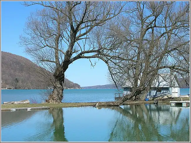 Near the southern end (the head end) of Skaneateles Lake, the hamlet of Glen Haven is situated in a splendidly scenic valley in the Town of Scott, Cortland County and the Town of Niles, Cayuga County. Nearby Spafford Landing is in the Town of Spafford, Onondaga County. The portion of the community on the eastern shore is known as "Fair Haven," to distinguish it from the western shore portion, known as "Glen Haven." The community provides marina and docking facilities, uncommon on the lake, together with dining and lodging accommodations.[1] Glen Haven has a historic library building, recalling earlier days when a large resort hotel attracted visitors arriving by steamboat.