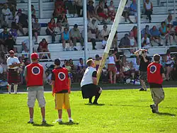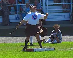 The caber toss event involves tossing a 22-foot-long spruce log weighing about 125 lbs. The stone thrower event involves hurling a 25-lb. rock shot-put style. The 28-lb. and 56-lb. weight throw events involves using a one-handed throw to heave an iron block with iron ring attached. For the 16-lb. hammer throw, competitors propel a round metal ball with a wooden handle. The 56-lb. weight toss event involves competitors launching the weight over a pole vault.[3]