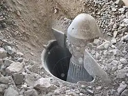 To minimise visual impact from the coast the quarry is sited 1 mi (1.6 km) inland, and cut down into the mountain 1,600 ft (500 m) above sea level. Each explosive blast dislodges about 70,000 tons of granite, which is transported by dump truck to the primary crusher, which reduces it to lumps no bigger than nine inches in diameter.[2] It is then transferred by conveyor belt to a heap that covers the "glory hole", a 1,000 ft (300 m) vertical shaft 10 ft (3 m) in diameter, which is permanently full of rocks. At the base of the glory hole, deep inside the mountain, rocks are transferred to a horizontal conveyor and moved through a 1-mile-long (1.6 km) tunnel to the second crusher on the shore, where oceangoing ships are loaded in the deep-water docks at the rate of 6,000 tons per hour.[2]