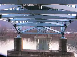The original bridge was built by the Penn Bridge Company of Beaver Falls and carried trolley tracks between Pittsburgh and Homestead. It was later paved with wood to allow vehicle traffic to share the crossing.[1] Permission was given by the Public Utilities Commission on November 8, 1962, for Pittsburgh Railways to convert trolley routes 55 East Pittsburgh via Homestead and Braddock and 98 Glassport to bus service, as the replacement bridge planned did not incorporate trolley tracks.[2] Trolley service 55 across the bridge ended on July 4, 1964.[3]