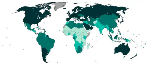 Global North and Global South are terms that denote a method of grouping countries based on their defining characteristics with regard to socioeconomics and politics. According to UN Trade and Development (UNCTAD), the Global South broadly comprises Africa, Latin America and the Caribbean, Asia (excluding Israel, Japan, and South Korea), and Oceania (excluding Australia and New Zealand).[1][3][a] Most of the Global South's countries are commonly identified as lacking in their standard of living, which includes having lower incomes, high levels of poverty, high population growth rates, inadequate housing, limited educational opportunities, and deficient health systems, among other issues.[b] Additionally, these countries' cities are characterized by their poor infrastructure.[c] Opposite to the Global South is the Global North, which the UNCTAD describes as broadly comprising Northern America and Europe, Israel, Japan, South Korea, Australia, and New Zealand.[1][3][a] Consequently the two groups do not correspond to the Northern Hemisphere or the Southern Hemisphere, as many of the Global South's countries are geographically located in the north and vice-versa.[4]