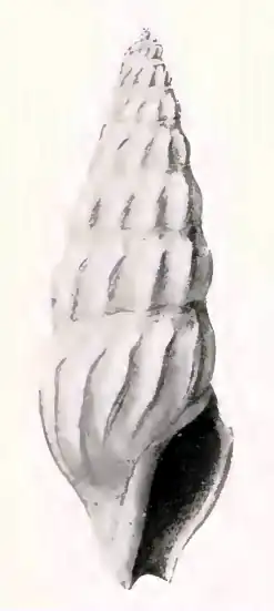(Original description) The shell is white, with a yellowish base. It is slender, acute, with a swollen smooth white protoconch of about two whorls and six subsequent whorls. The suture is appressed. On the earlier whorls the posterior edge is prominent. The whorls are moderately rounded. The spiral sculpture is absent from the spire, on the body whorl hardly visible except on the extreme anterior base and the siphonal fasciole where there are a few impressed lines. The axial sculpture of (on the body whorl 12) consists of somewhat sigmoid ribs, feebly arcuate on the anal fasciole, strongest in front of it, rather sharp-edged, extending mostly over the base, and with somewhat wider interspaces. They are not continuous up the spire. The aperture is rather narrow. The anal sulcus is conspicuous, with a subsutural callus. The outer lip is thin, sharp, with a ribless space and a small varix behind it, smooth internally. The inner lip and columella are callous and smooth. The siphonal canal is distinct, small, narrow, short, somewhat recurved, with an evident siphonal fasciole.[2]