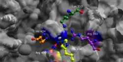 Essential residues in the active site of vanadium haloperoxidases include: Lys353, Arg360, Arg490, His404, and His496. Corresponding residues in the active site of glucose 6-phosphatase-α include Arg170 and Arg83, which donate hydrogen ions to the phosphate, stabilizing the transition state, His119, which provides a proton to the dephosphorylated oxygen attached to glucose, and His176, which completes a nucleophilic attack on the phosphate to form a covalently bound phosphoryl enzyme intermediate.[9] Within the Vanadium-containing chloroperoxidase, Lys353 was found to stabilize the phosphate in the transition state. However, the corresponding residue in glucose 6-phosphatase-α (Lys76) resides within the ER membrane and its function, if any, is currently undetermined. With the exception of Lys76, these residues are all located on the luminal side of the ER membrane.[5]