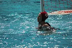 The primary role of the goalkeeper is to block shots at the goal.[25] After saving the ball, the goalkeeper has the responsibility to keep possession of the ball in order to stop opposing players regaining possession.[26] They must make sure that whenever the opposition appears to be ready to make a shot on goal, their hands are near or above the surface of the water.[27] They also possess the job to pass down the pool accurately to retain possession of the ball,[28] often starting the team's counterattack.[29]