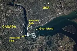 The island was formed during the recent retreat of the falls as it cut inward (upstream) through the Niagara Escarpment. The Niagara River's channel splits in two above the falls, creating two sets of falls, one on either side of the island.[2] In 1959–60, the island's eastern side was extended about 8.5 acres (34,000 m2) for additional parking and a helicopter pad.[3] Fill was provided from excavation for the construction of the Robert Moses State Parkway. In 1954–1955 the area between the Terrapin Rocks and Goat Island was filled in, creating Terrapin Point.[4]