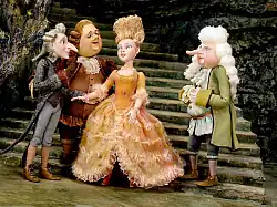 The film used all the techniques that digital puppet animation afforded to the animators when the movement started in the 1980s. The technique of replaceable articulation or the use of replaceable lower jaws of the character conditionally imitating speech was a major innovation in puppet animation.[4] The animators drew inspiration from the classic stop-motion films of Ivan Ivanov-Vano such as Go There, Don't Know Where and those by Tim Burton.[13] The film is constructed in the traditions of the 18th and 19th century. A recording of ancient 18th-century minuets was used to describe the choreography of the dance partners in Hoffmaniada.[4]