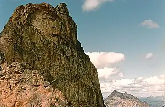 Golden Horn is an 8,366-foot (2,550-metre) mountain summit located in Okanogan County in Washington, United States. It is part of the Okanogan Range which is a sub-range of the North Cascades Range.[1] Golden Horn is situated north of Methow Pass at headwaters of the Methow River, on land administered by the Okanogan–Wenatchee National Forest. It ranks as the 101st-highest summit in Washington.[2] The nearest higher neighbor is Tower Mountain, 1.67 miles (2.69 km) to the southeast.[1] Topographic relief is significant as the summit rises approximately 3,366 feet (1,026 meters) above the West Fork Methow River in one mile (1.6 km). The first ascent of Golden Horn was made by Fred Beckey, Keith Rankin, and Charles Welsh on September 18, 1946.[4]